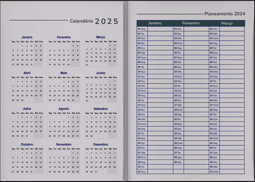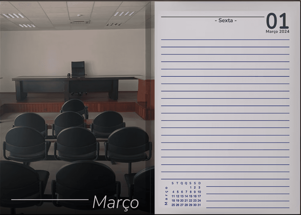 Criação de uma agenda personalizada com foco em organização editorial, legibilidade e adaptação ao contexto institucional do tribunal. O projeto envolveu o desenvolvimento da estrutura gráfica interna, hierarquia de informações e identidade visual adequada ao uso diário do material.